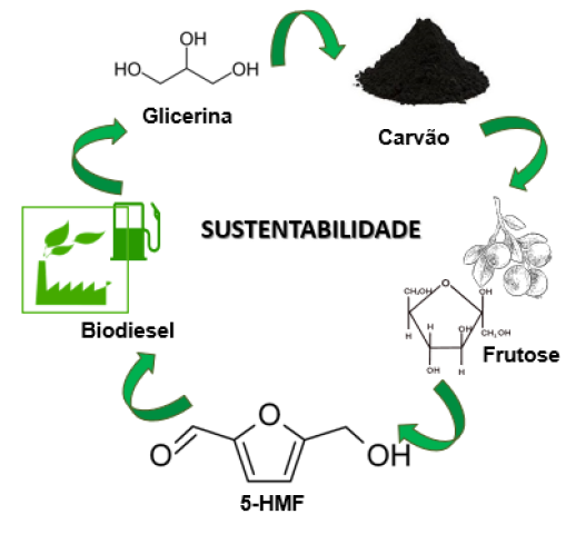 A produção do 5-HMF também é um processo sustentável, pois pode ser obtido a partir da desidratação de hexoses. As hexoses são um tipo de carboidratos, açucares simples contendo seis carbonos, encontrado em diversas fontes naturais. A frutose, é a hexose mais estudada para a produção do 5-HMF, devido ao seu processo de desidratação mais fácil comparada as demais. Para a desidratação, que se refere a eliminação de três moléculas de água da estrutura da frutose, são utilizados catalisadores que são substâncias que aceleram as reações químicas e podem ser integralmente removidos do meio ao fim do processo. O ácido sulfúrico (H2SO4) é o catalisador mais utilizado na desidratação da frutose para a obtenção do 5-HMF, porém seu uso apresenta desafios. A corrosividade do ácido pode danificar os equipamentos e gerar resíduos que precisam ser tratados adequadamente para evitar a poluição ambiental. Uma alternativa promissora é o uso do carvão modificado como catalisador. Carvões são estruturas formadas majoritariamente por carbono, juntamente com pequenas quantidades de outros elementos, como hidrogênio, oxigênio, nitrogênio e enxofre, dependendo do processo de produção e das impurezas presentes na matéria prima. Uma forma de tornar o processo cada vez mais sustentável é utilizar resíduos para a síntese de carvão.